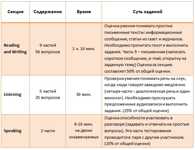 KET — тест начального уровня сложности (Elementary). Три части экзамена определяют навыки владения языком на начальном этапе изучения. Сертификат KET удостоверяет, что вы можете объясняться на английском языке, используя базовые фразы и выражения, понимать несложный письменный текст, можете рассказать о себе и ответить на простые вопросы.